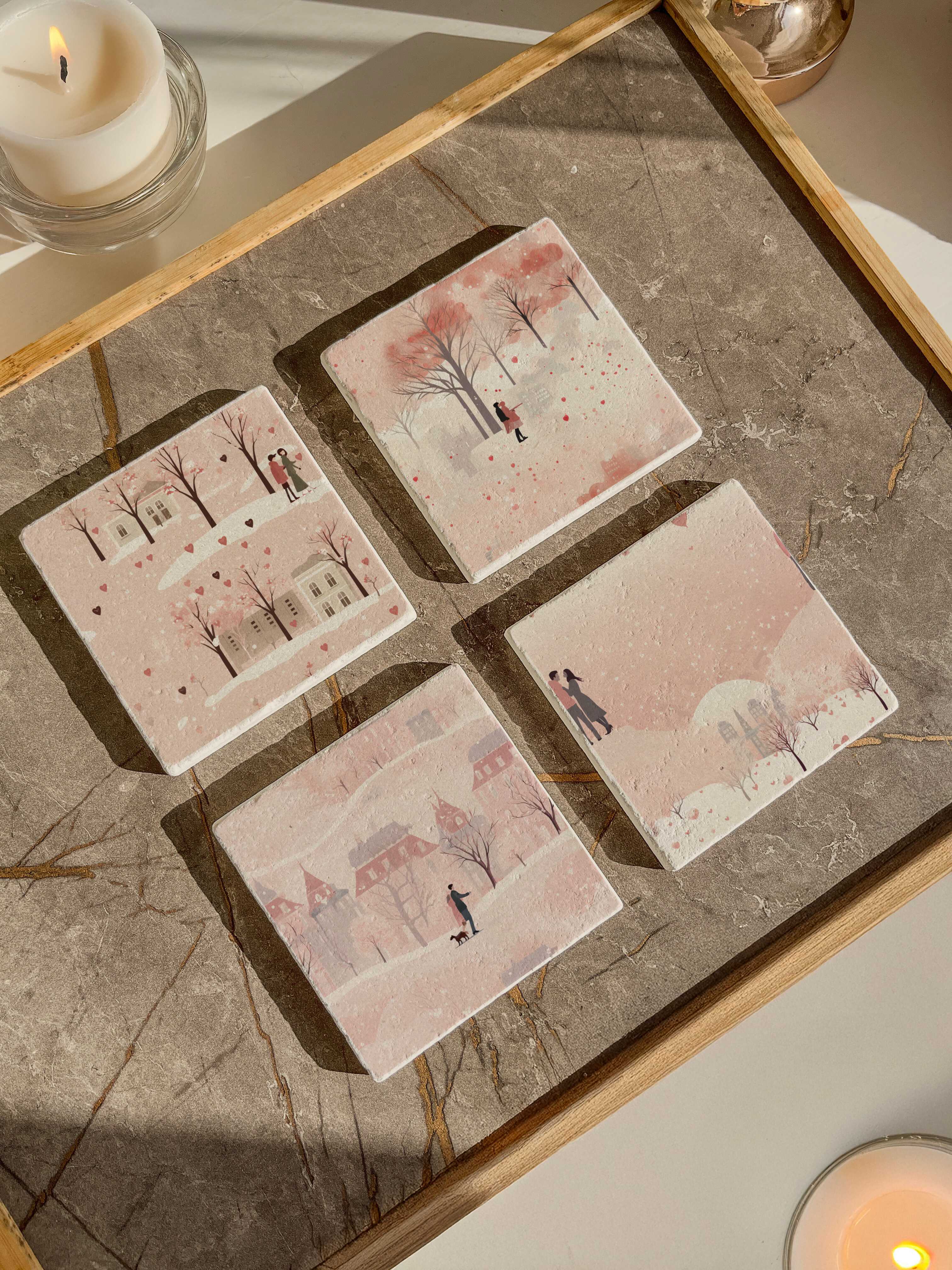Huzur ve sıcaklığı yansıtan kış manzaralarıyla tasarlanmış romantik bardak altlıkları! Yumuşak pastel tonlar ve minimalist detaylarla hazırlanan bu ürünler, sofralarınıza şıklık ve romantizm katıyor.