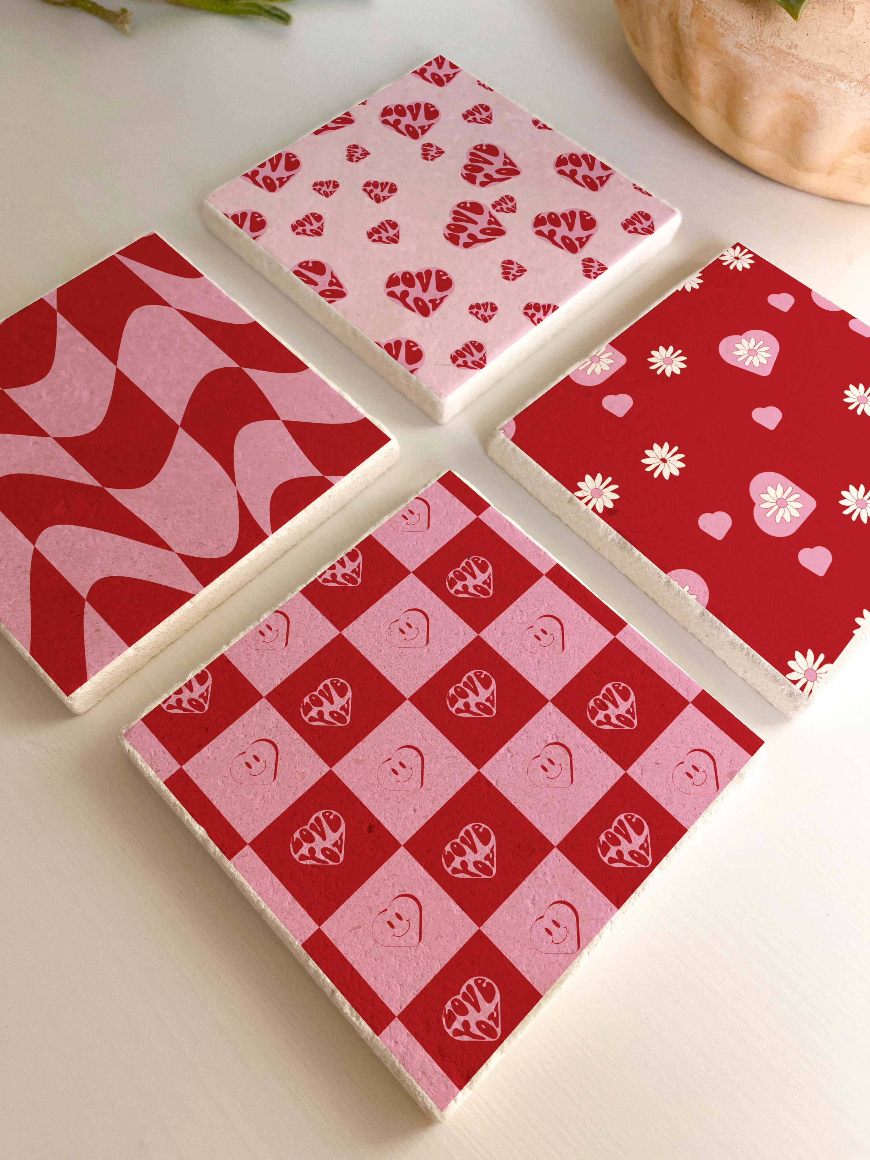 Aşkın ve romantizmin simgesi kırmızı ve pembe tonlarıyla tasarlanmış Sevgililer Günü temalı bardak altlıkları! Kalp, çiçek ve modern desenleriyle şık ve eğlenceli bir dekoratif detay sunar.
