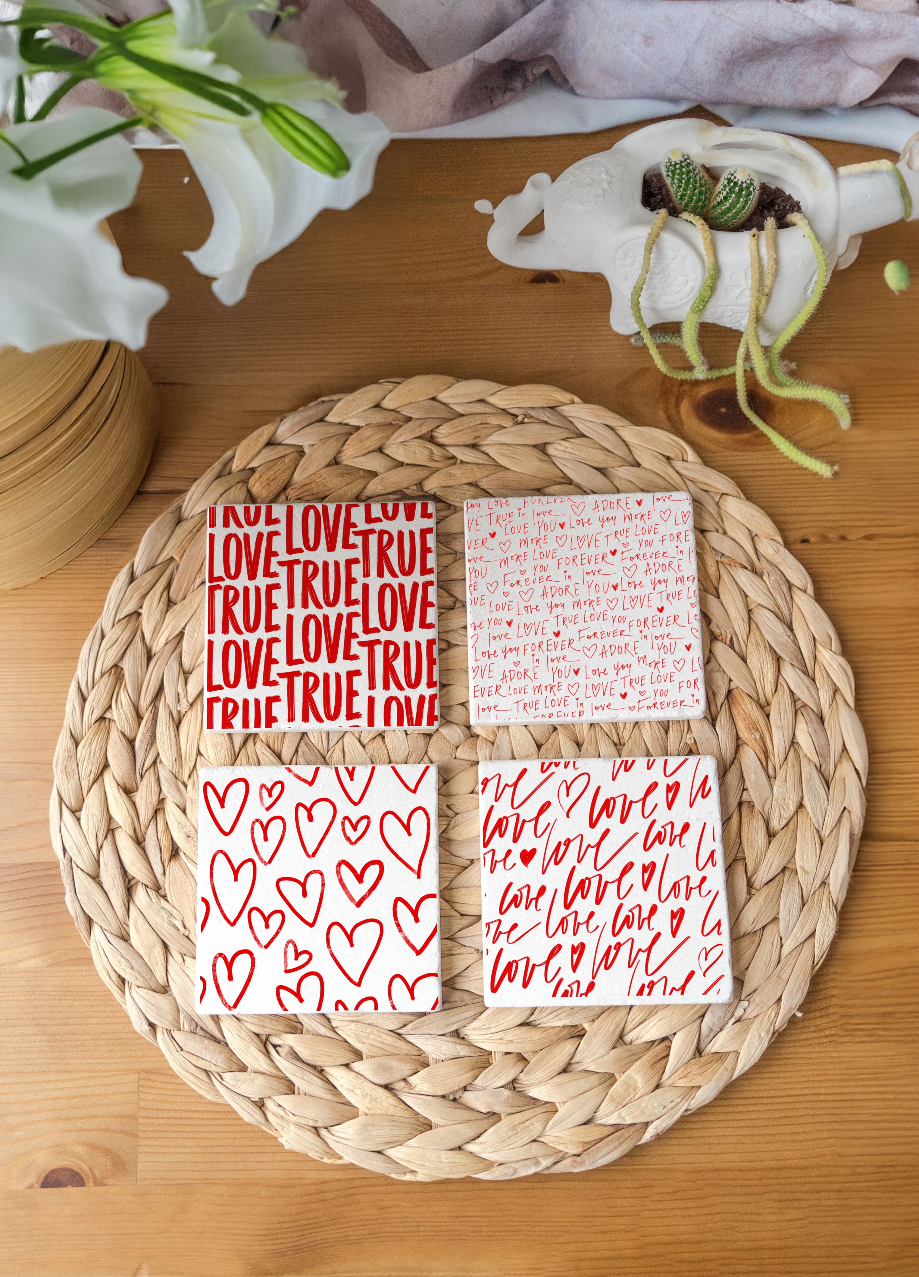 Aşk Temalı Bardak Altlığı, Sevgililer Günü Hediyesi -4'lü Set Doğal Taş